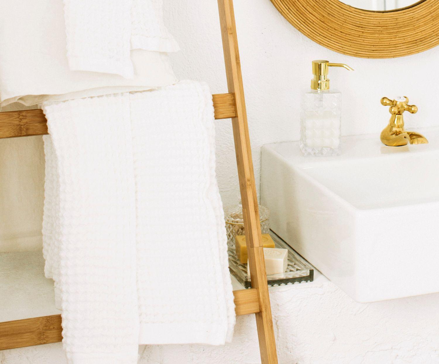 Decorative ladder made of natural bamboo with a brown finish, designed as a lightweight and versatile piece of furniture to add a warm and organic touch to any room in your home. Perfect for hanging towels, blankets, or accessories, or simply as a decorative element that combines style and functionality.