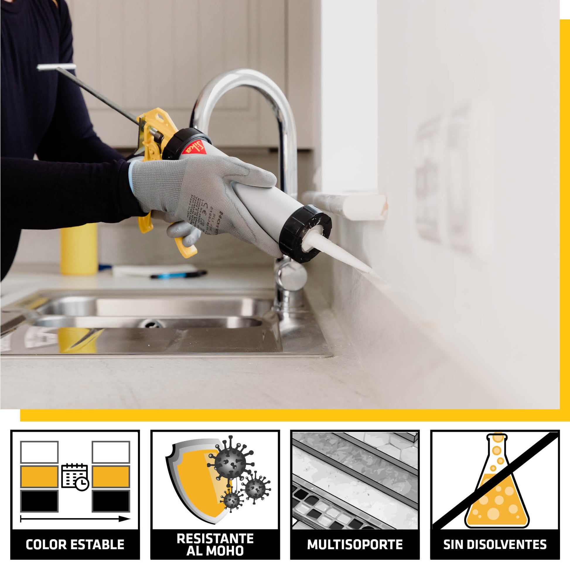 Thanks to its neutral curing technology, it exhibits very good adhesion to multiple materials without the need for a primer, making it ideal for bathrooms, kitchens, and areas exposed to water.